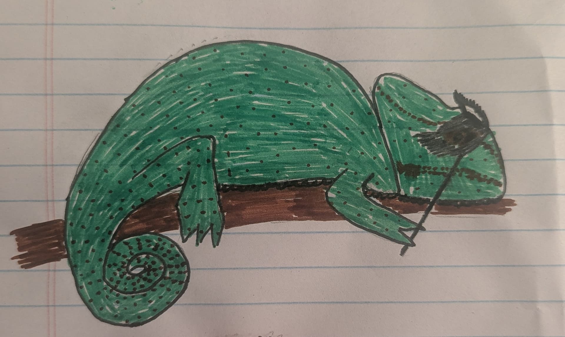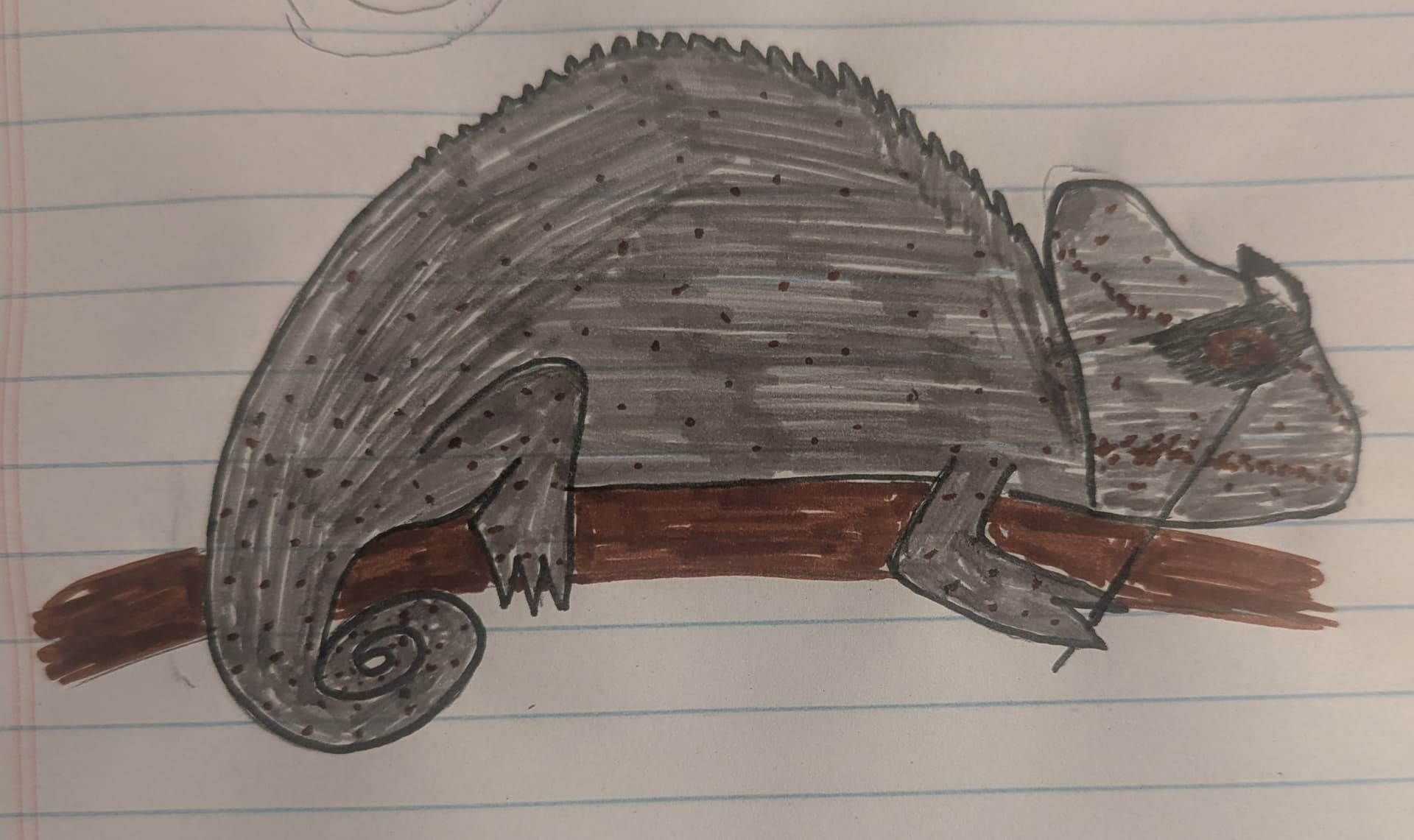General: a chameleon holding a masquerade mask in front of its face to hide its true colors. When summoned, the color of the chameleon changes to match its phobie type (green for monster, red for mechanical, blue for dimensional, and gray for undead). The area behind the mask and around the eyes, however, is brown.