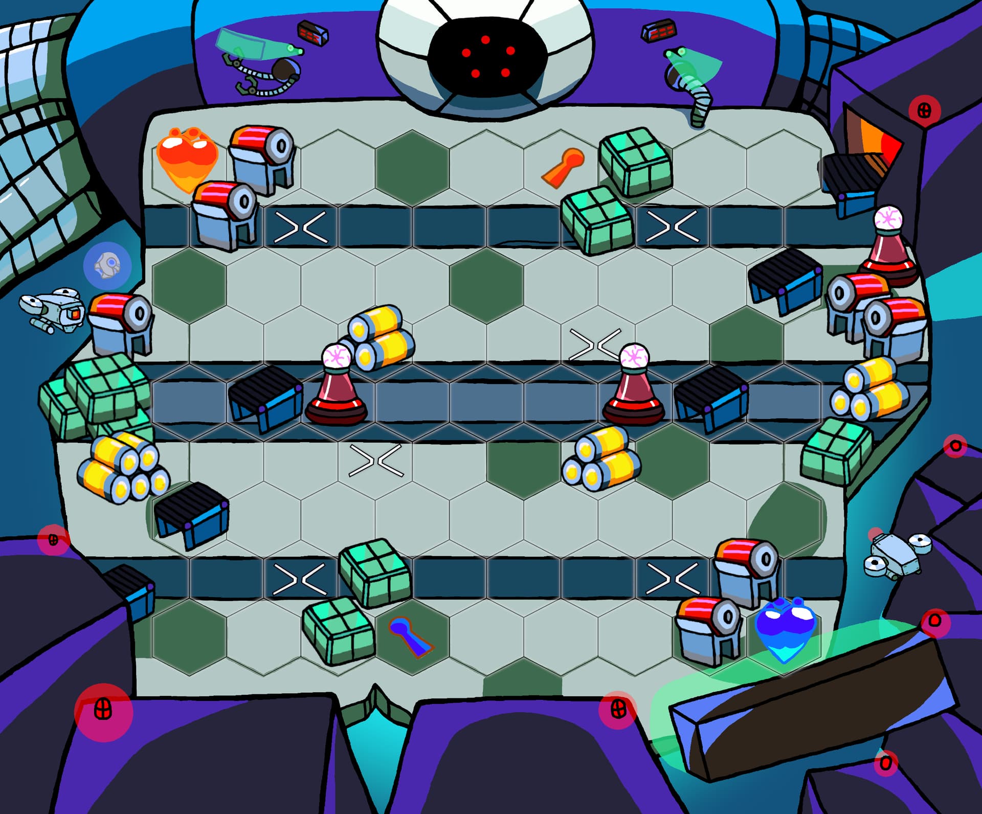 In this map, both players spawn nearly on top of a panic point. However, it is obvious to both players early in the map that anything they place in the hotly contested center is likely to be immediately destroyed. The early game would rely on achieving a balance between flipping the middle point cheaply, and gaining territorial control over the two sides.